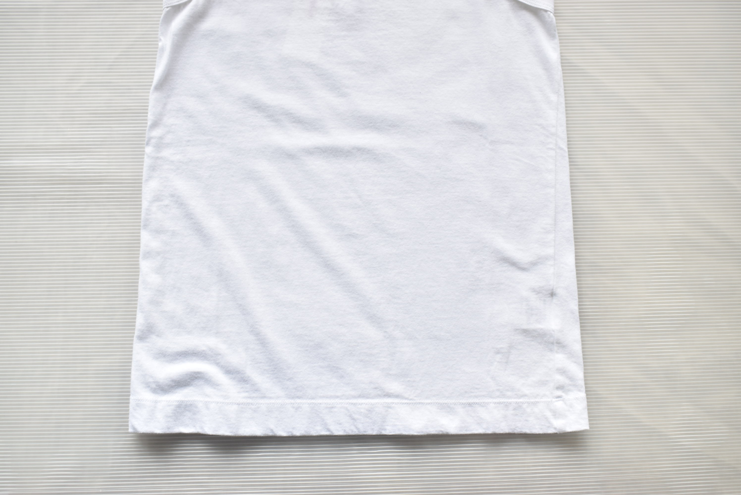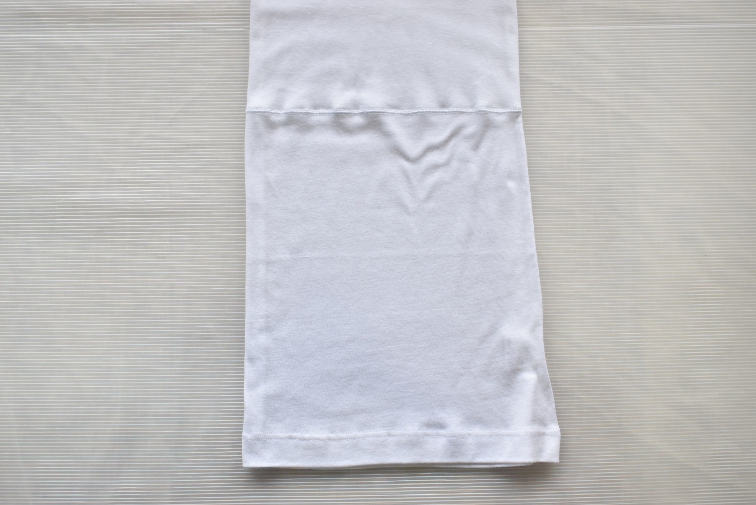 30番手単糸の天竺は、ウェイトは中肉で柔らかさがある素材。首元と脇下は同素材を使った切替。