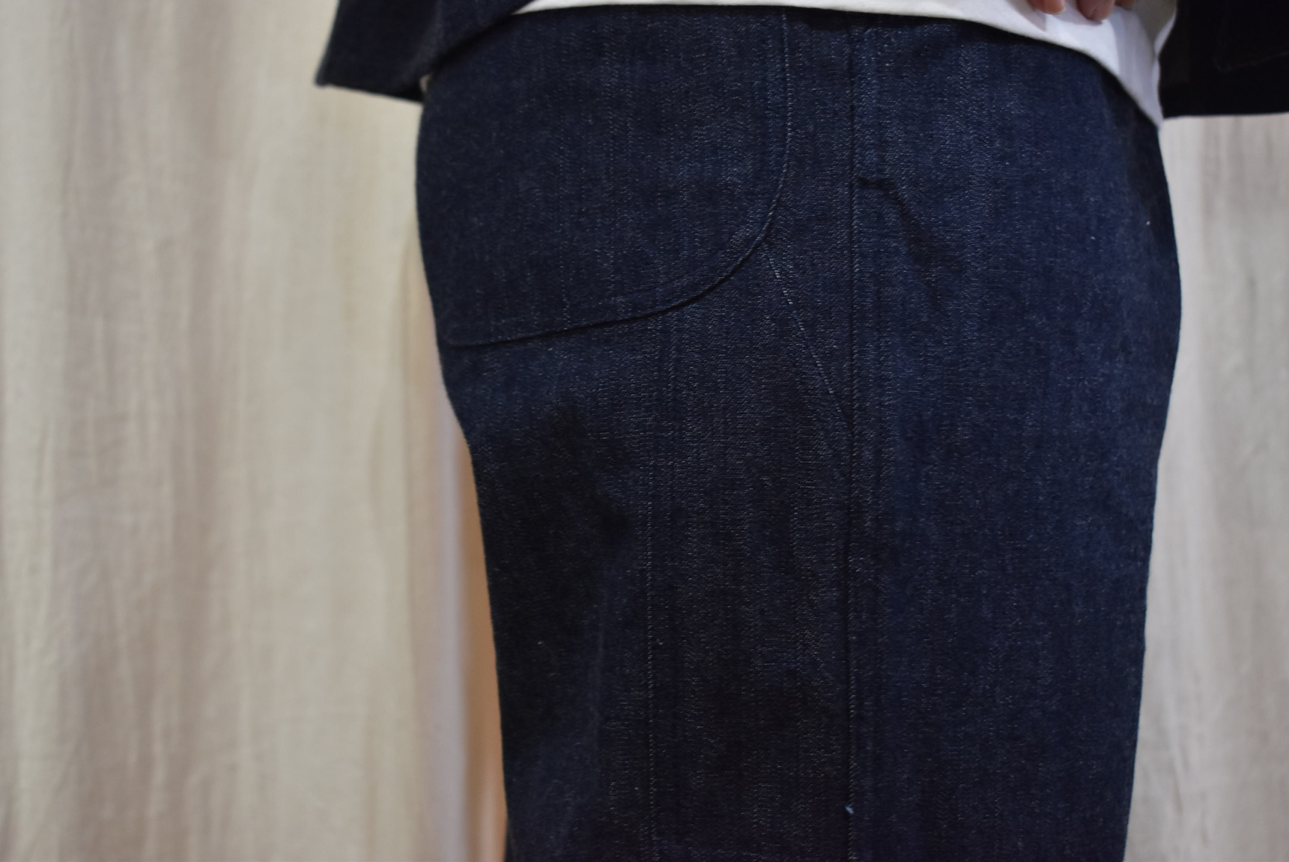 ペインターパンツらしい部分としては、ペン挿し用のポケットが付くのとバックポケットが丸みを帯びた曲線のデザイン。