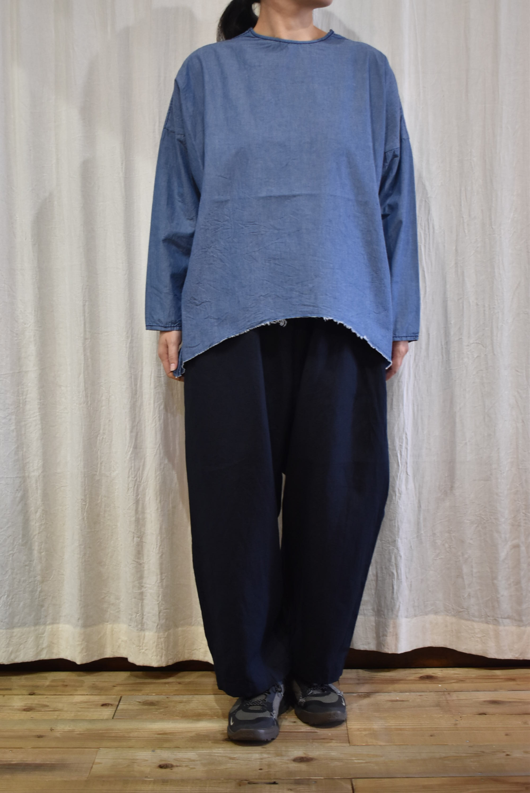 ブルーに組み合わせたのはダークネイビーのRiverのパンツ。素材はコットン×和紙。