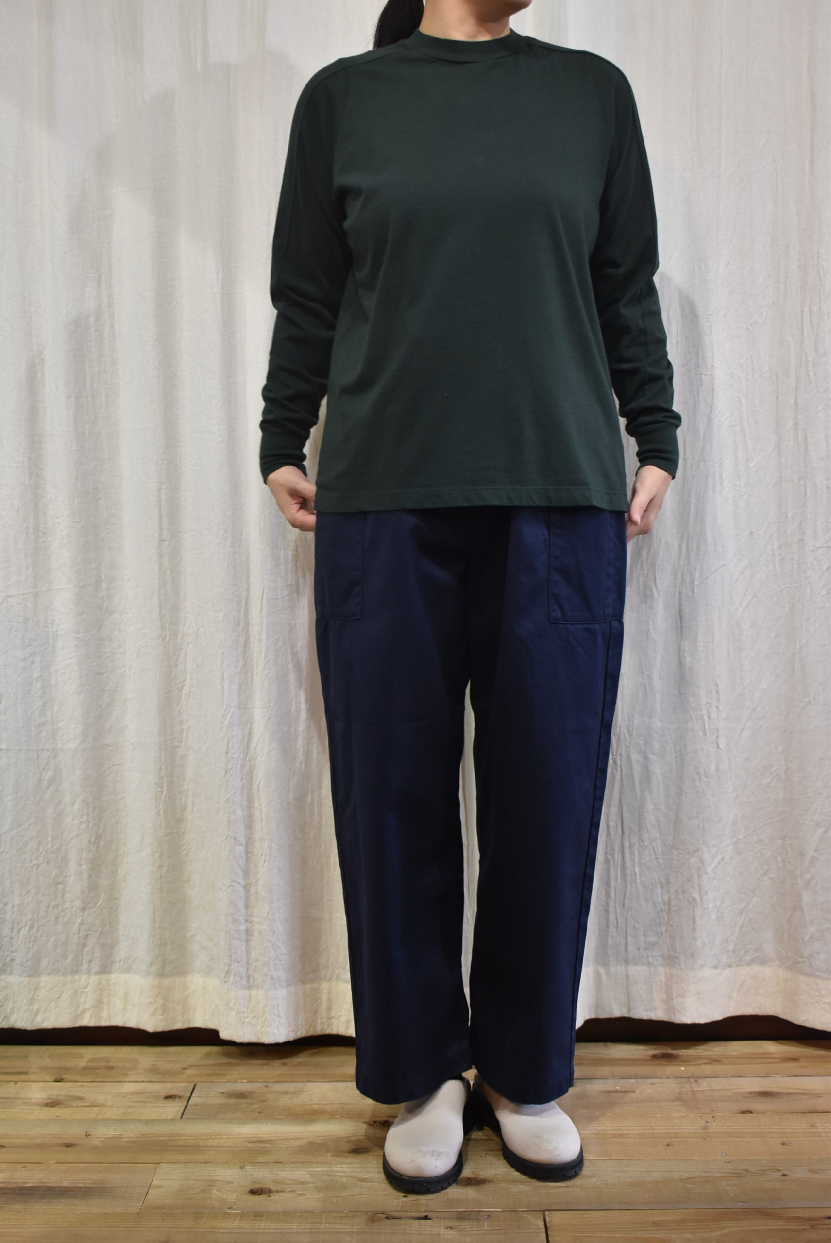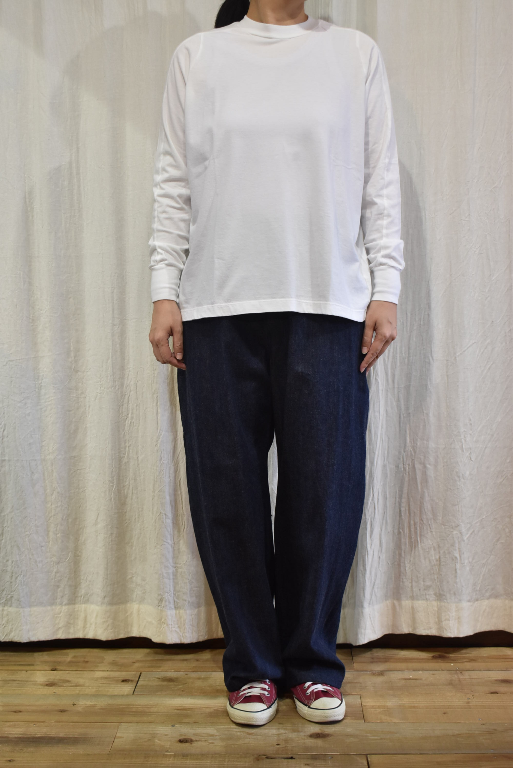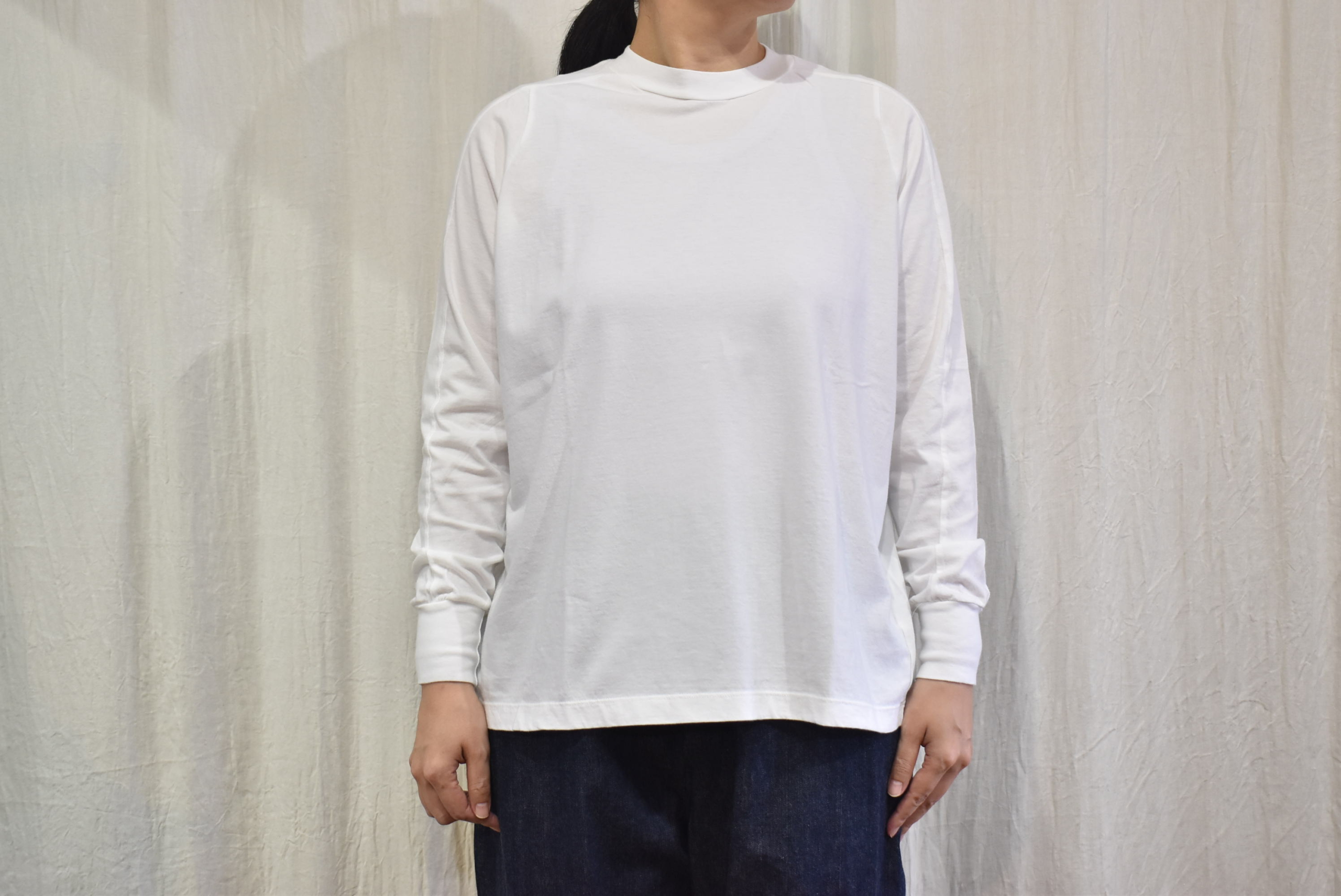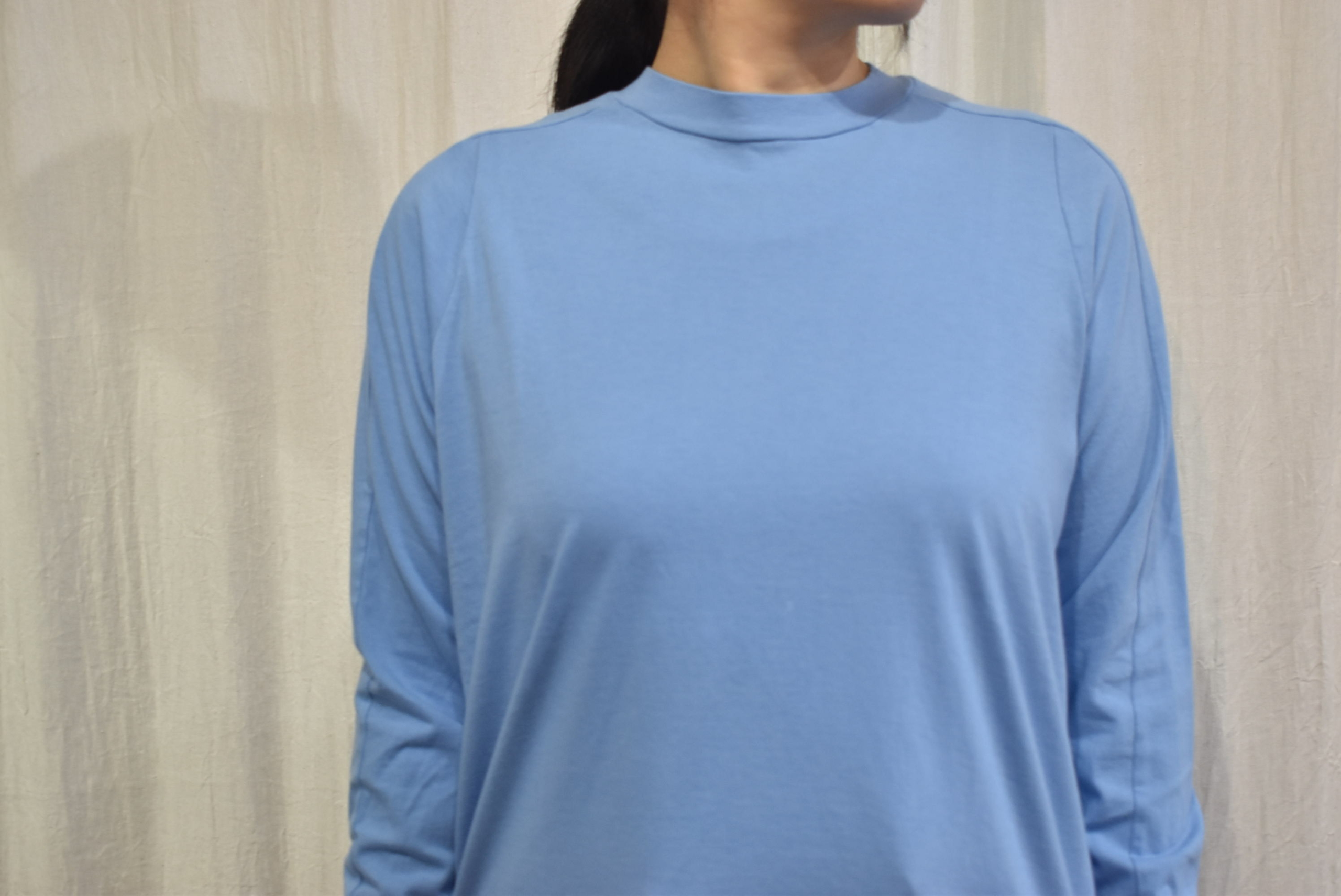 ハイネックギャザーは丈違いの2サイズ展開でしたが、こちらはワンサイズで身幅や着丈もゆるやかな設定となっています。