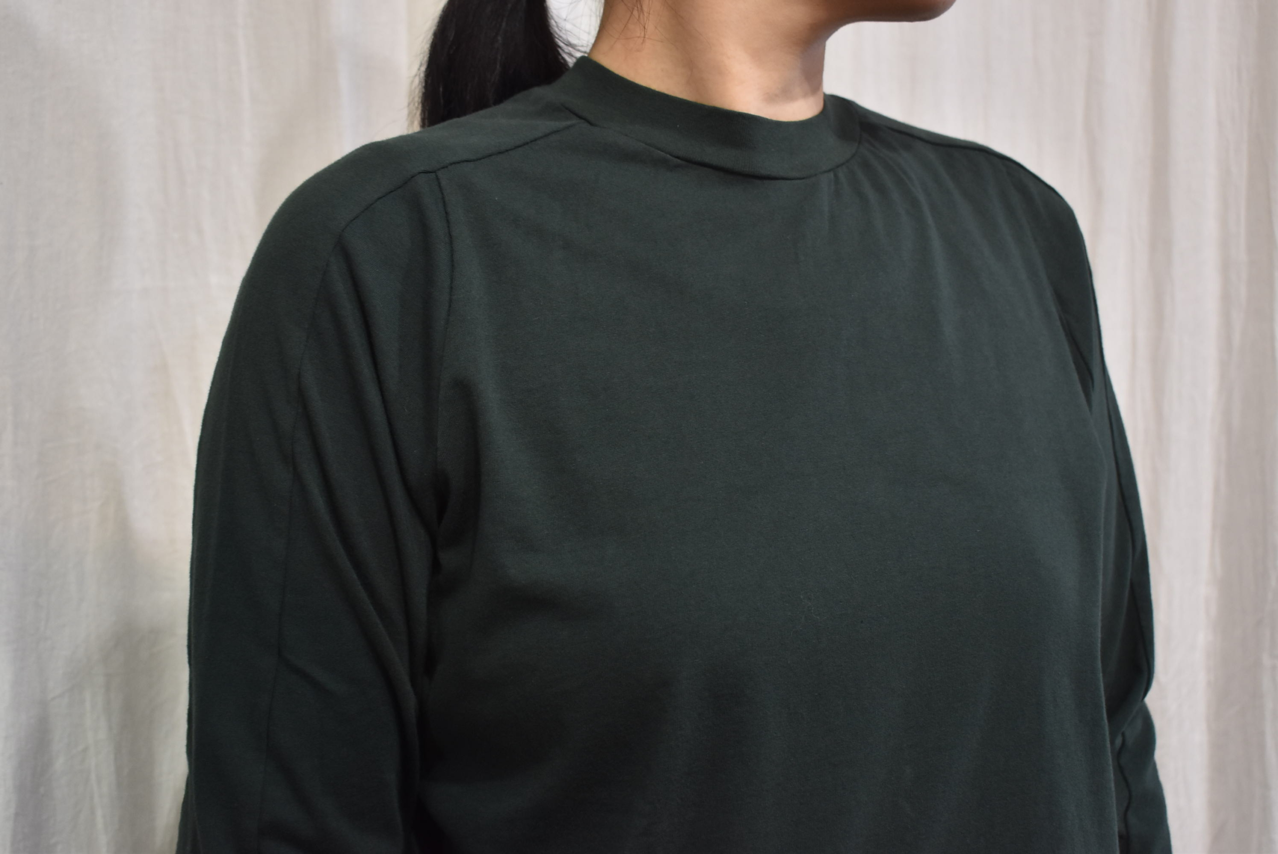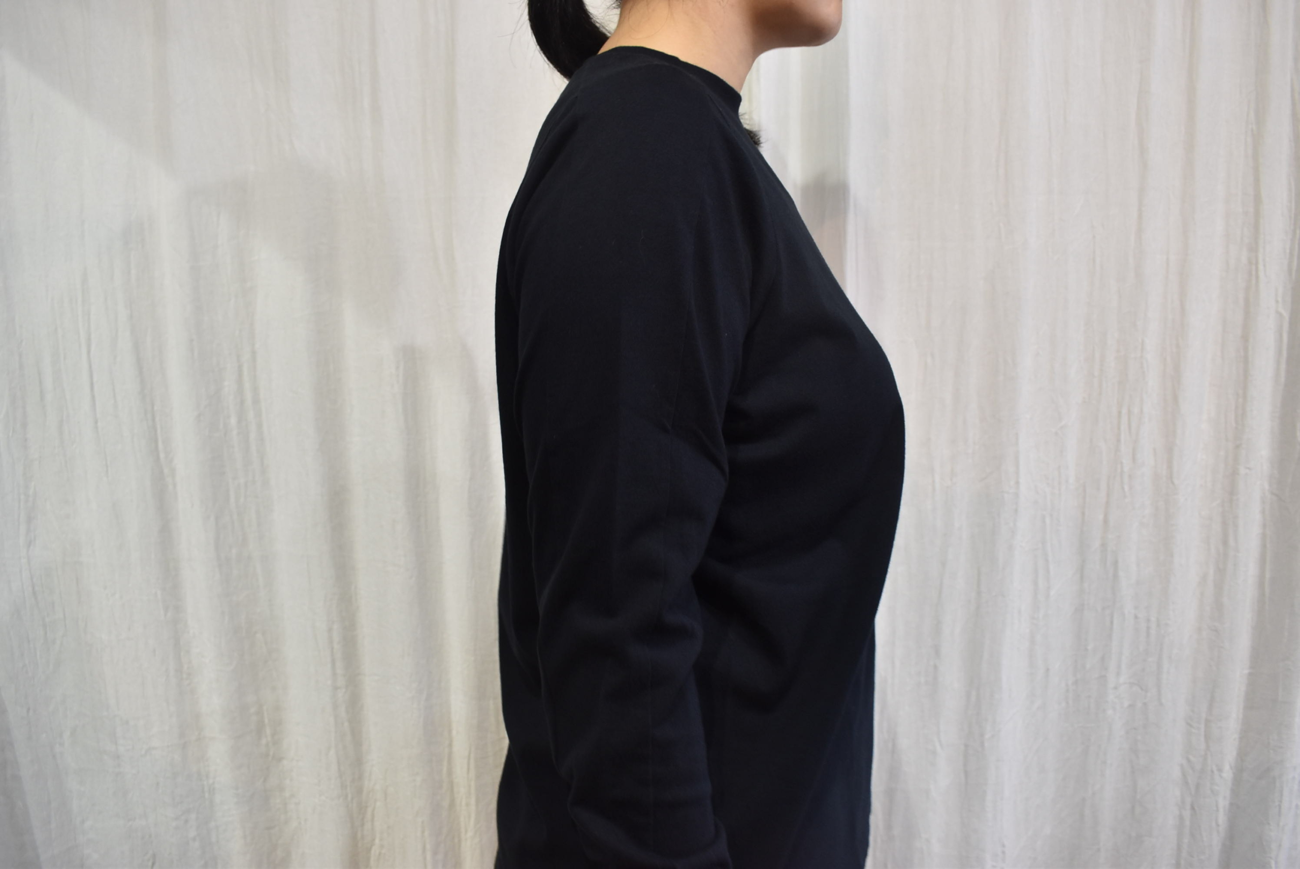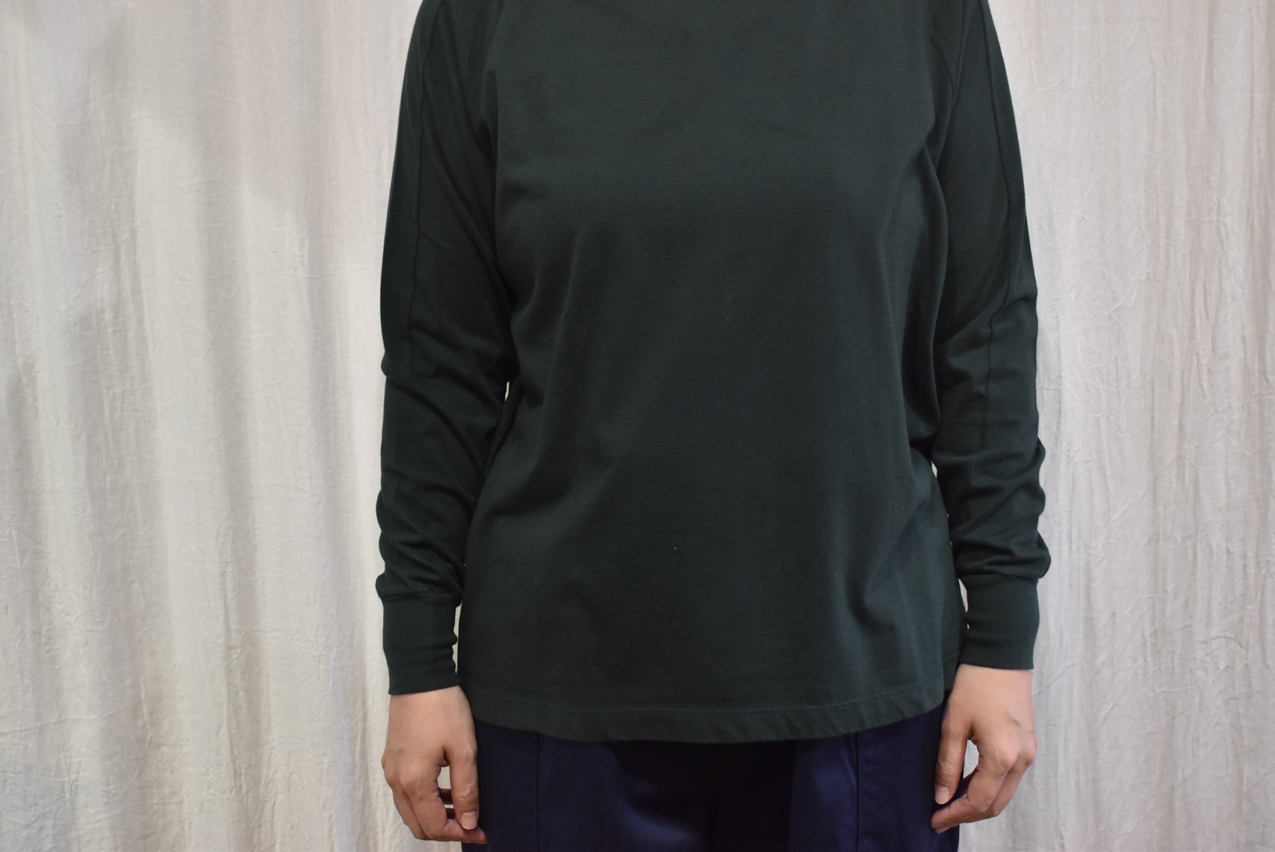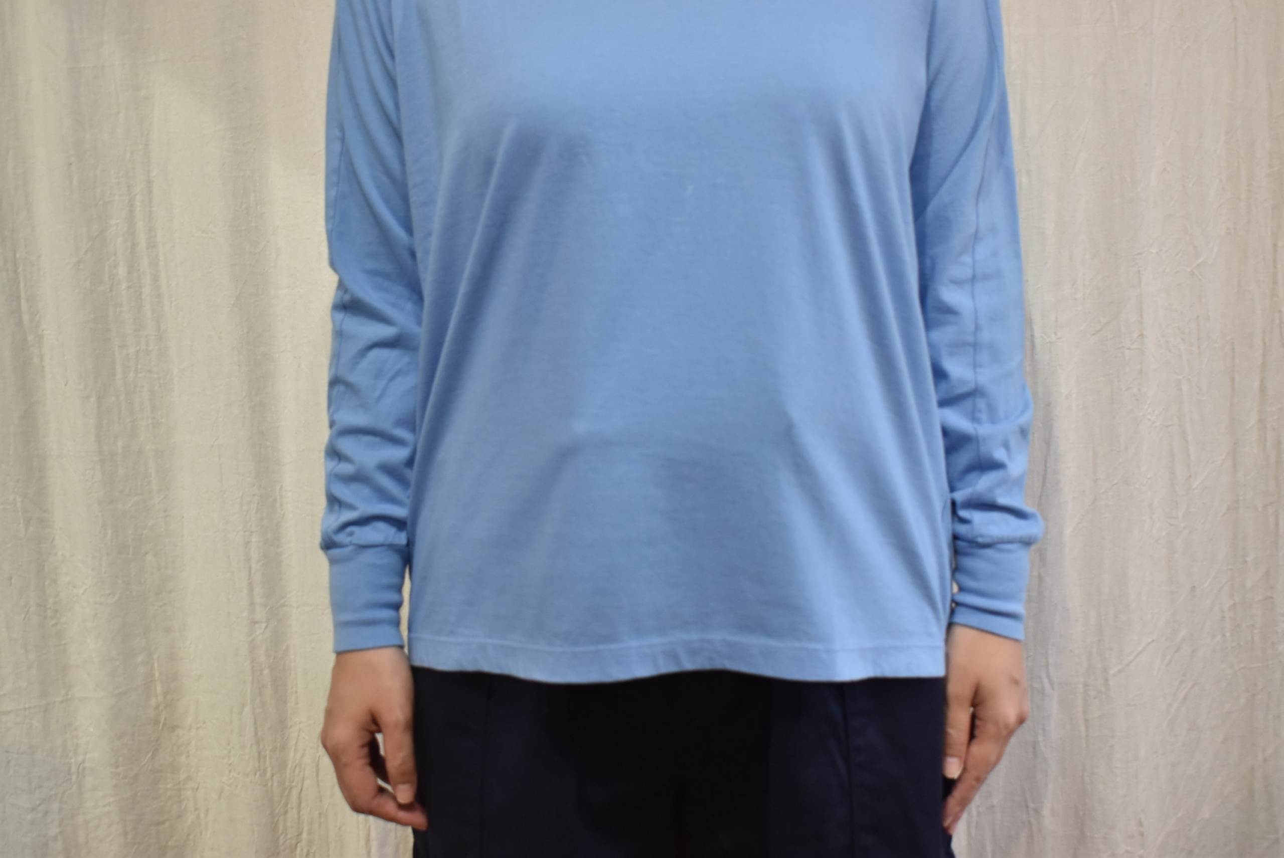 長袖カットソー。柔らかい首元の詰まり具合、そして襟ぐりから肩と袖にかけての切替と袖口のリブ。