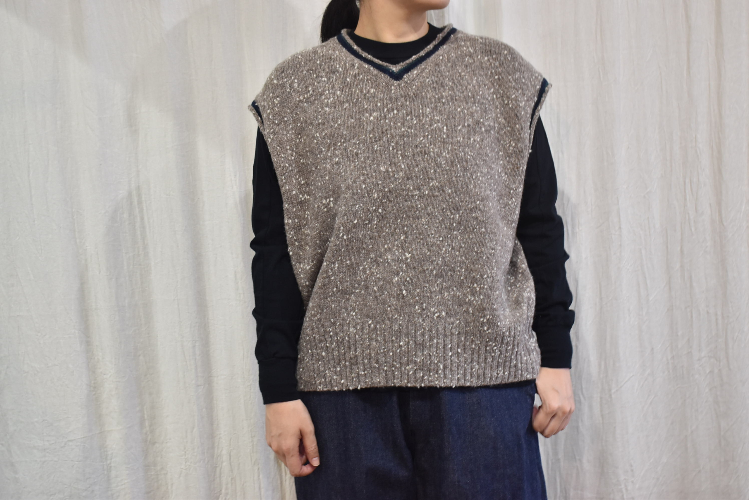 homspunのノーカラーJKとの相性も、言わずもがなですが、バランス良くしっくりきますよ。