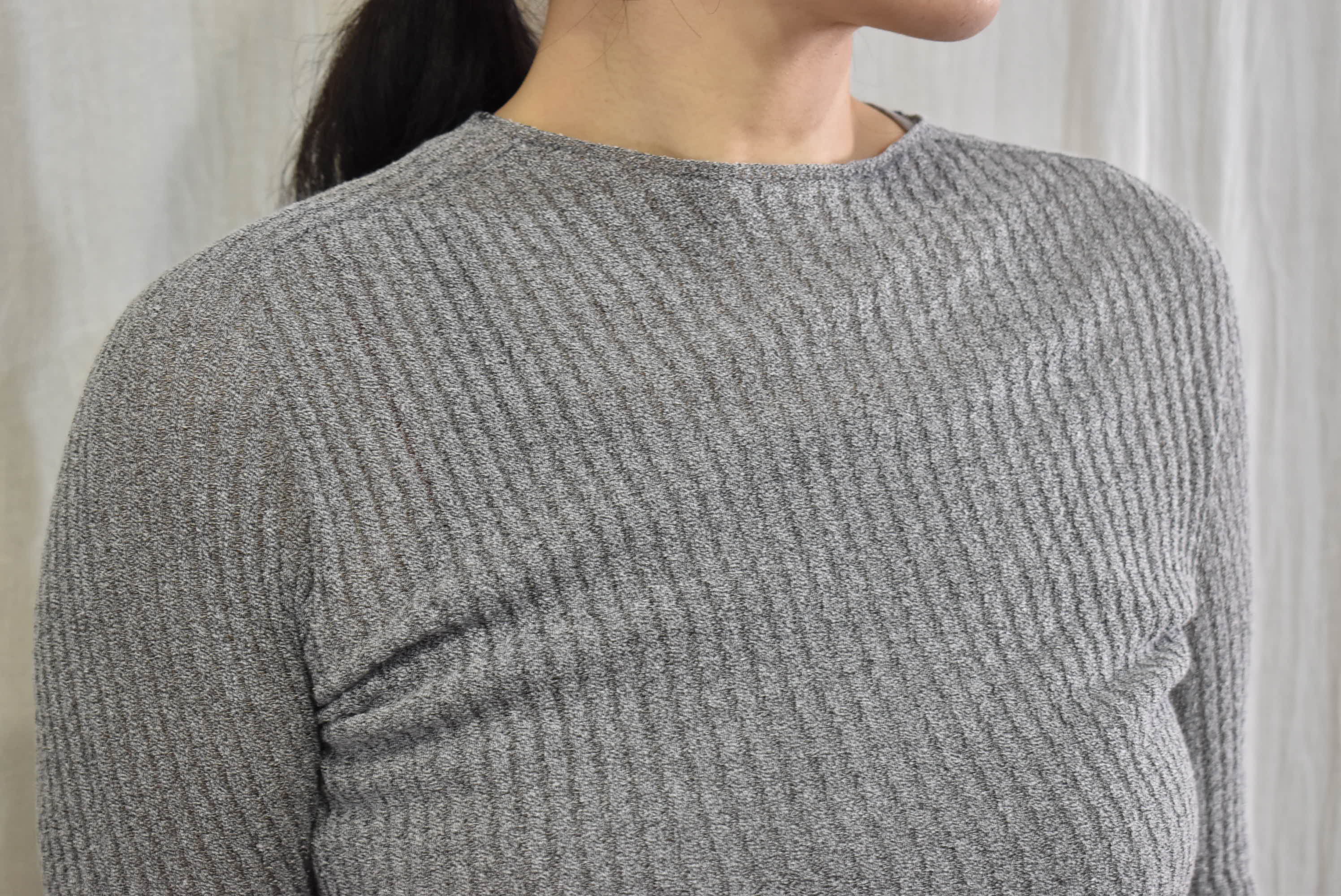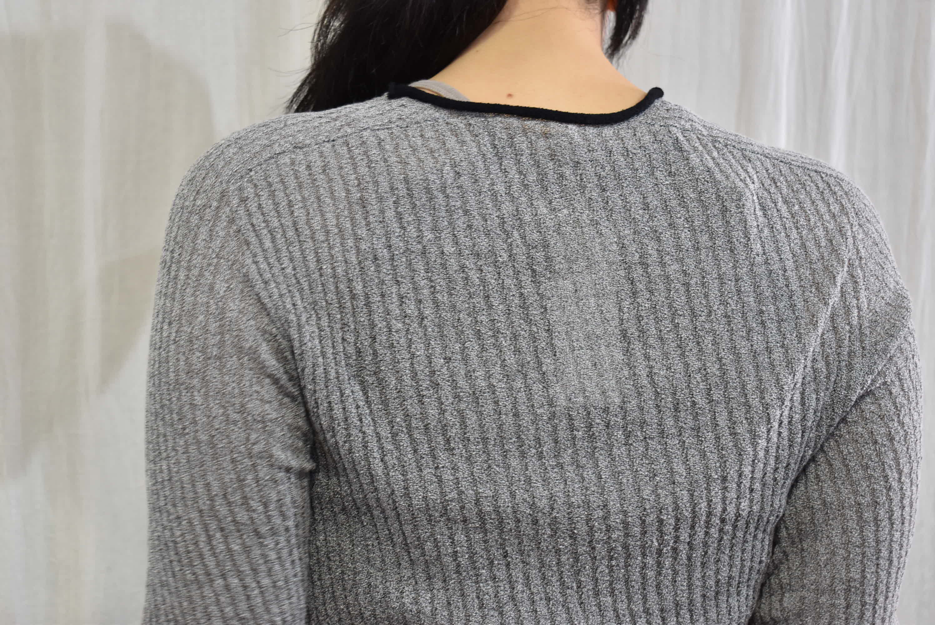 張り付いてはいない、でも包まれている・・・そんな感じ。それこそ無縫製で編み立てたニットならではの着心地。