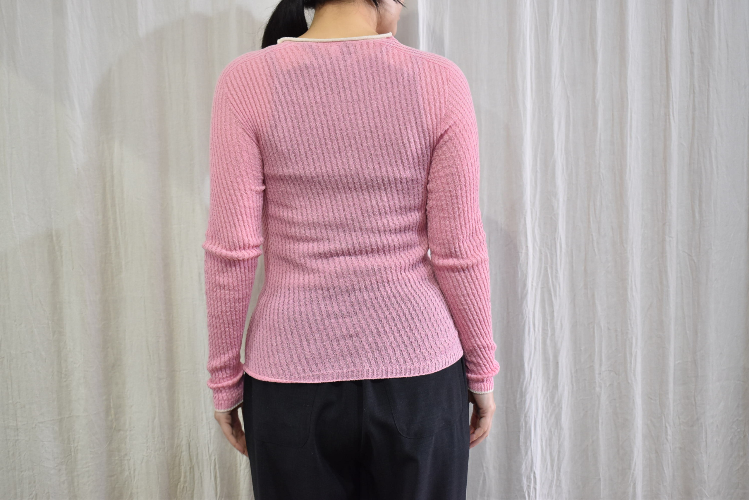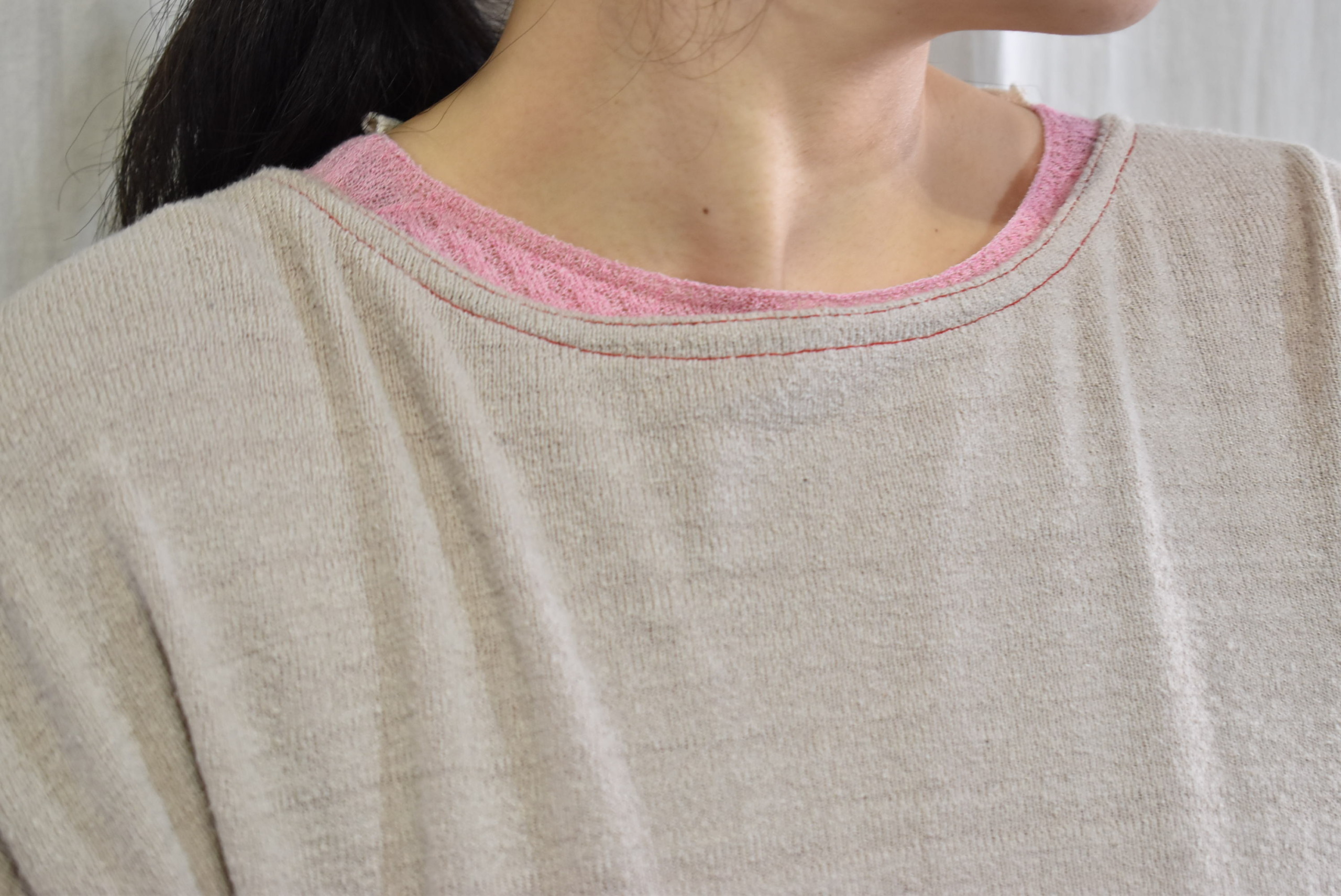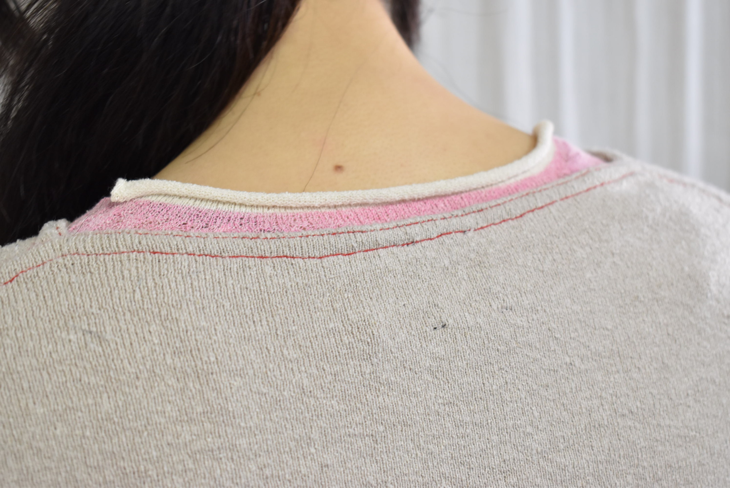 さらに首裏のところには、シルクセーターの配色赤いステッチに、リブインナーのピンク・ホワイトの配色が