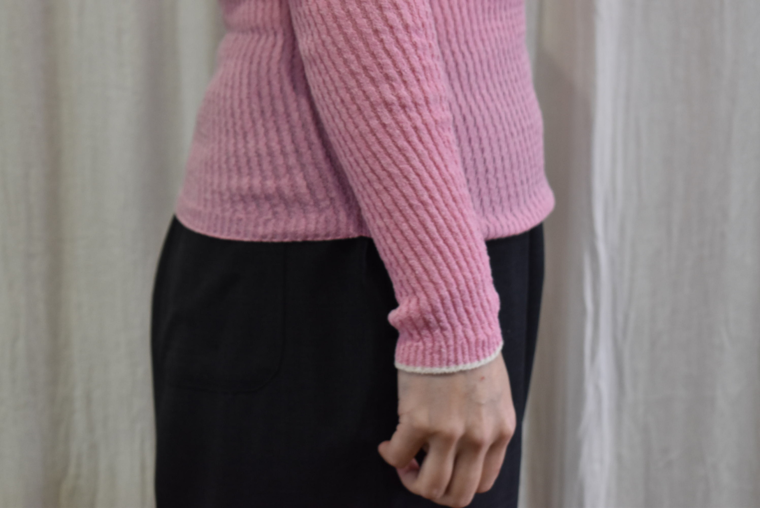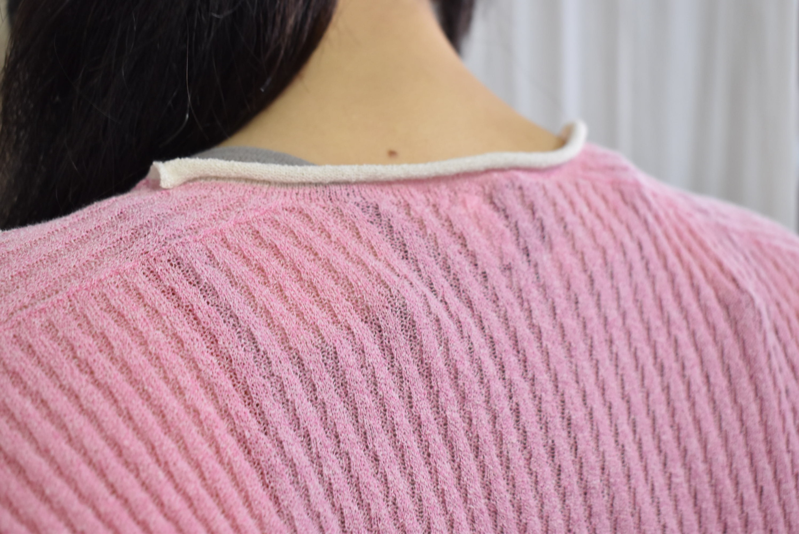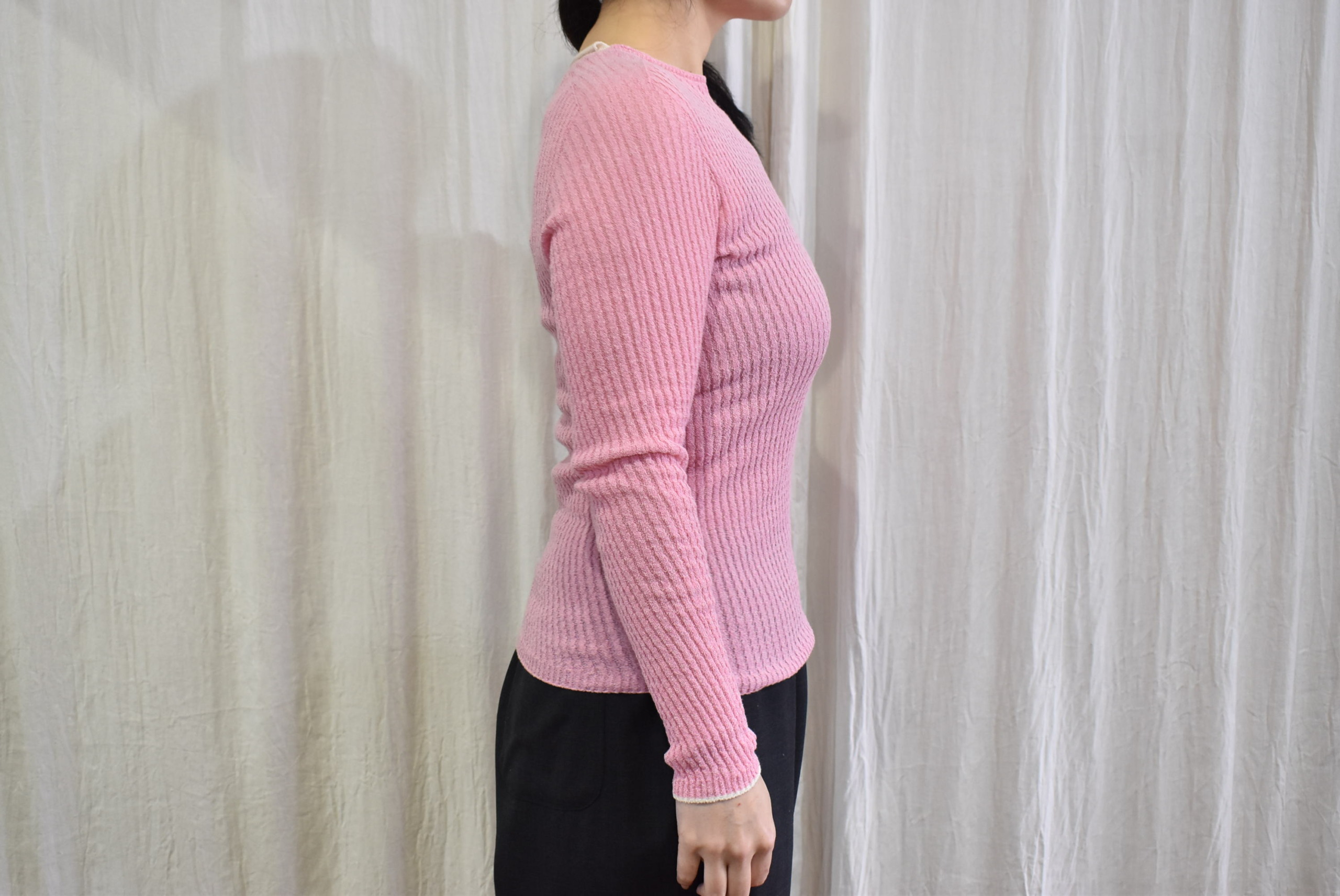 さらに首裏のところには、シルクセーターの配色赤いステッチに、リブインナーのピンク・ホワイトの配色が