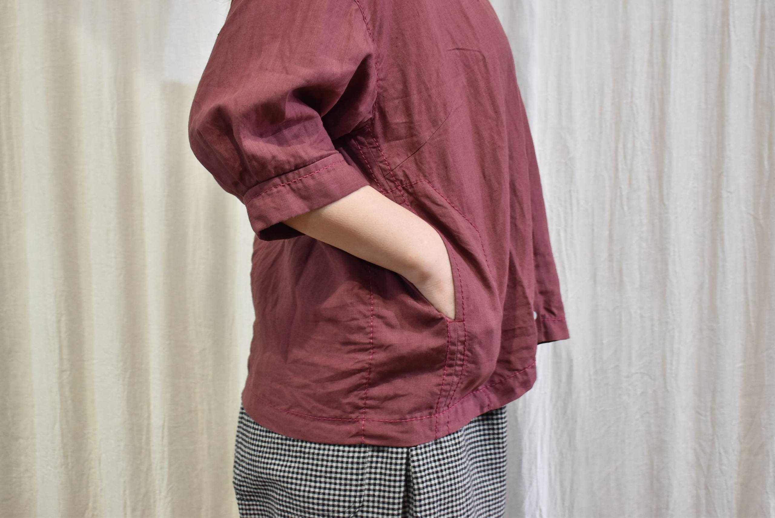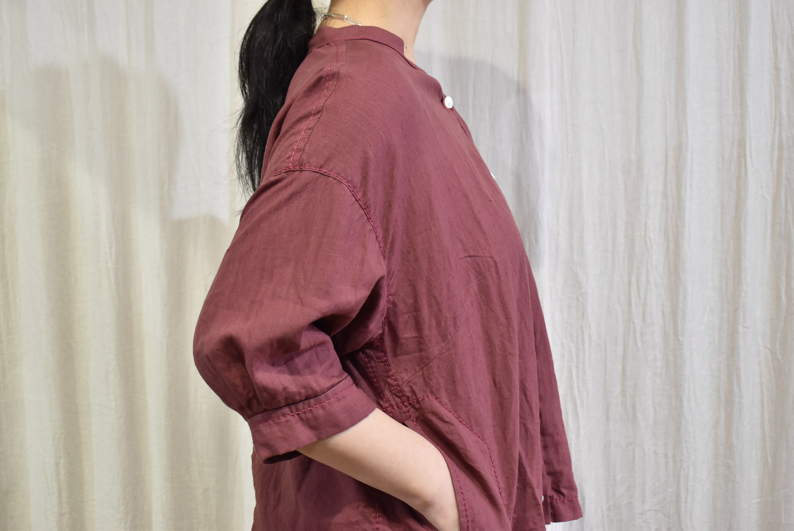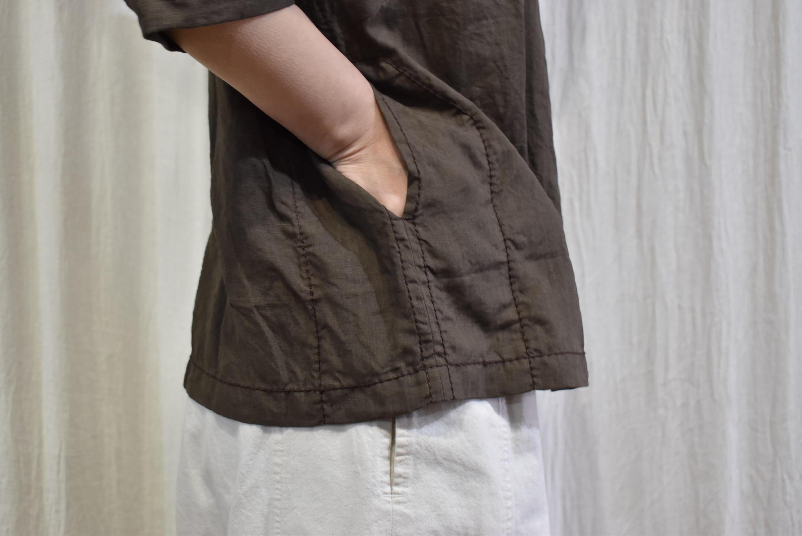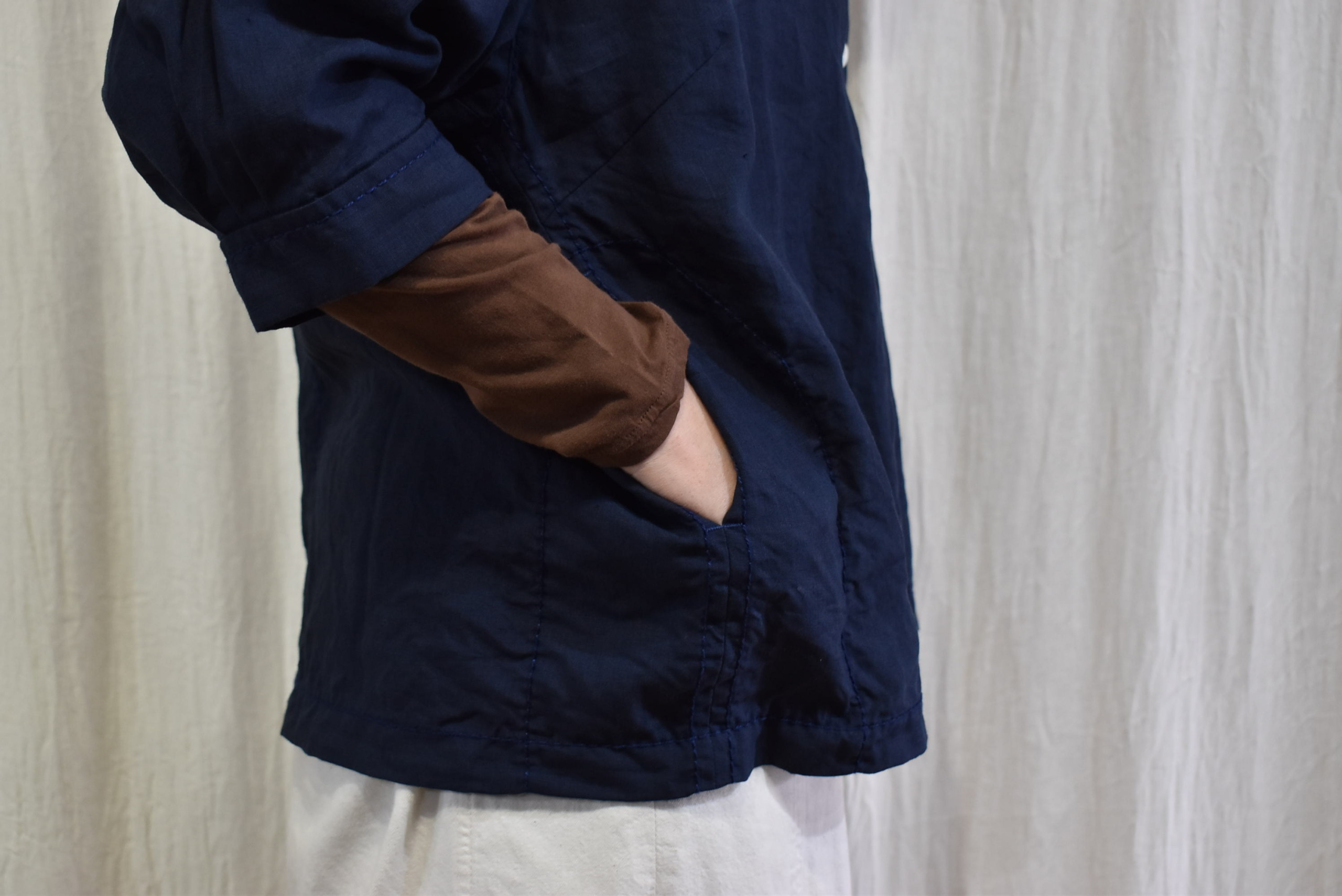 両サイドにはコンパクトなポケットもステッチとともに配されていますので、羽織りものとしての役割も担う
