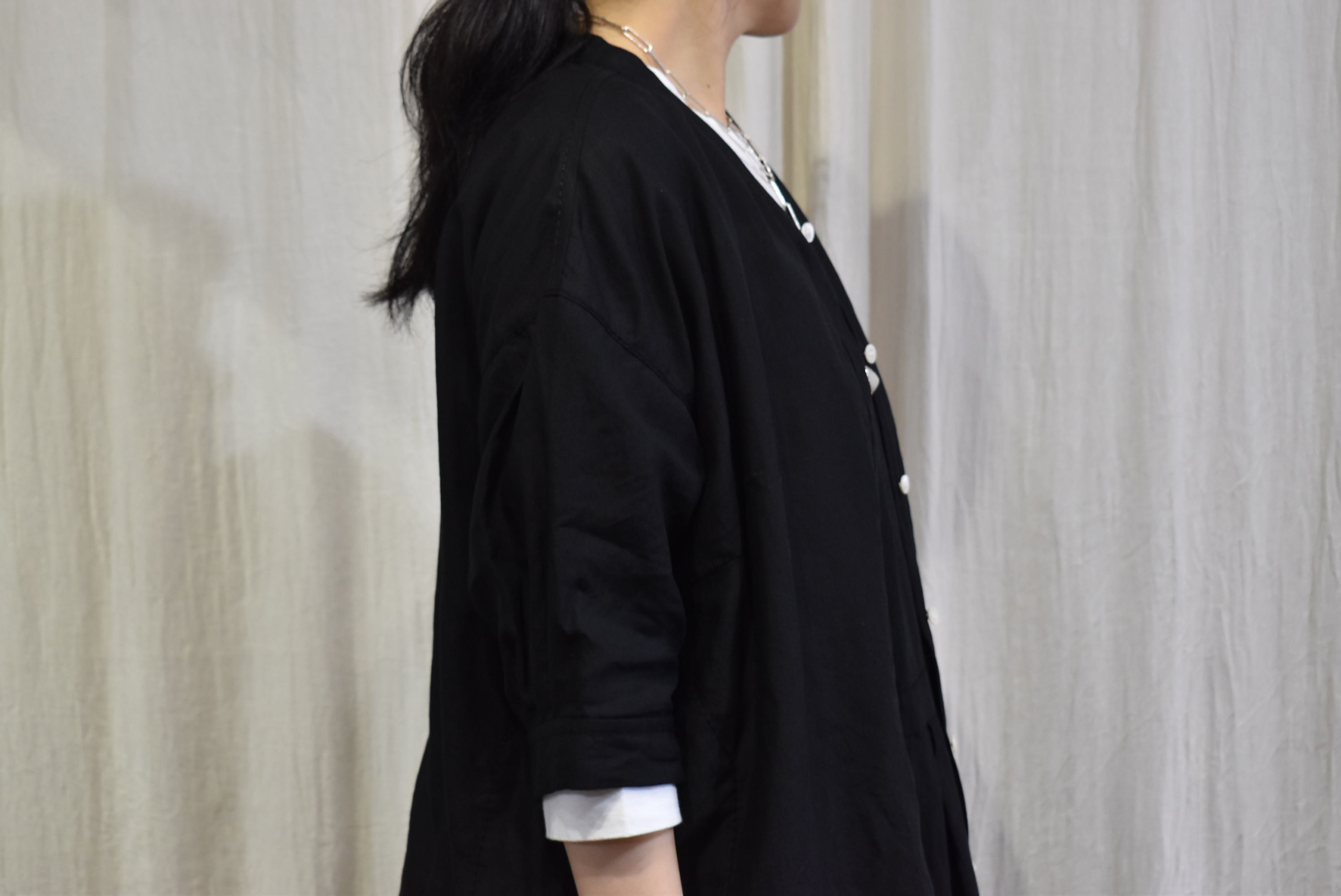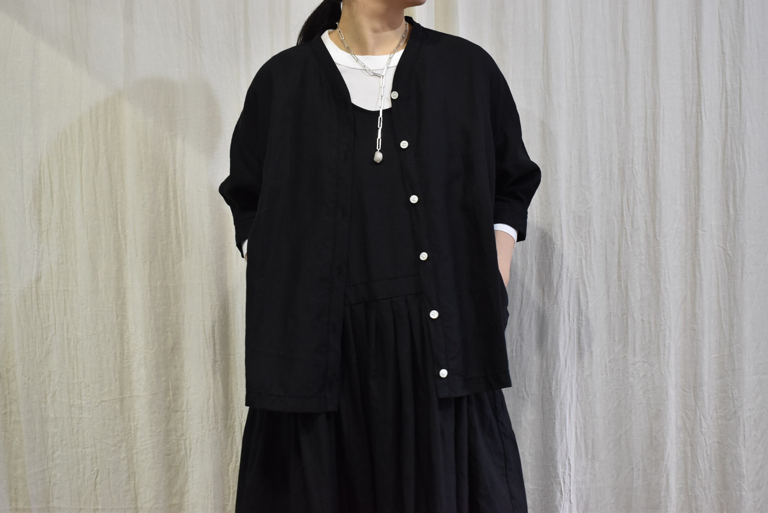 最後のカラーは王道のブラックを、同素材のノースリーブワンピースの上に前開きでバサッと羽織りました。