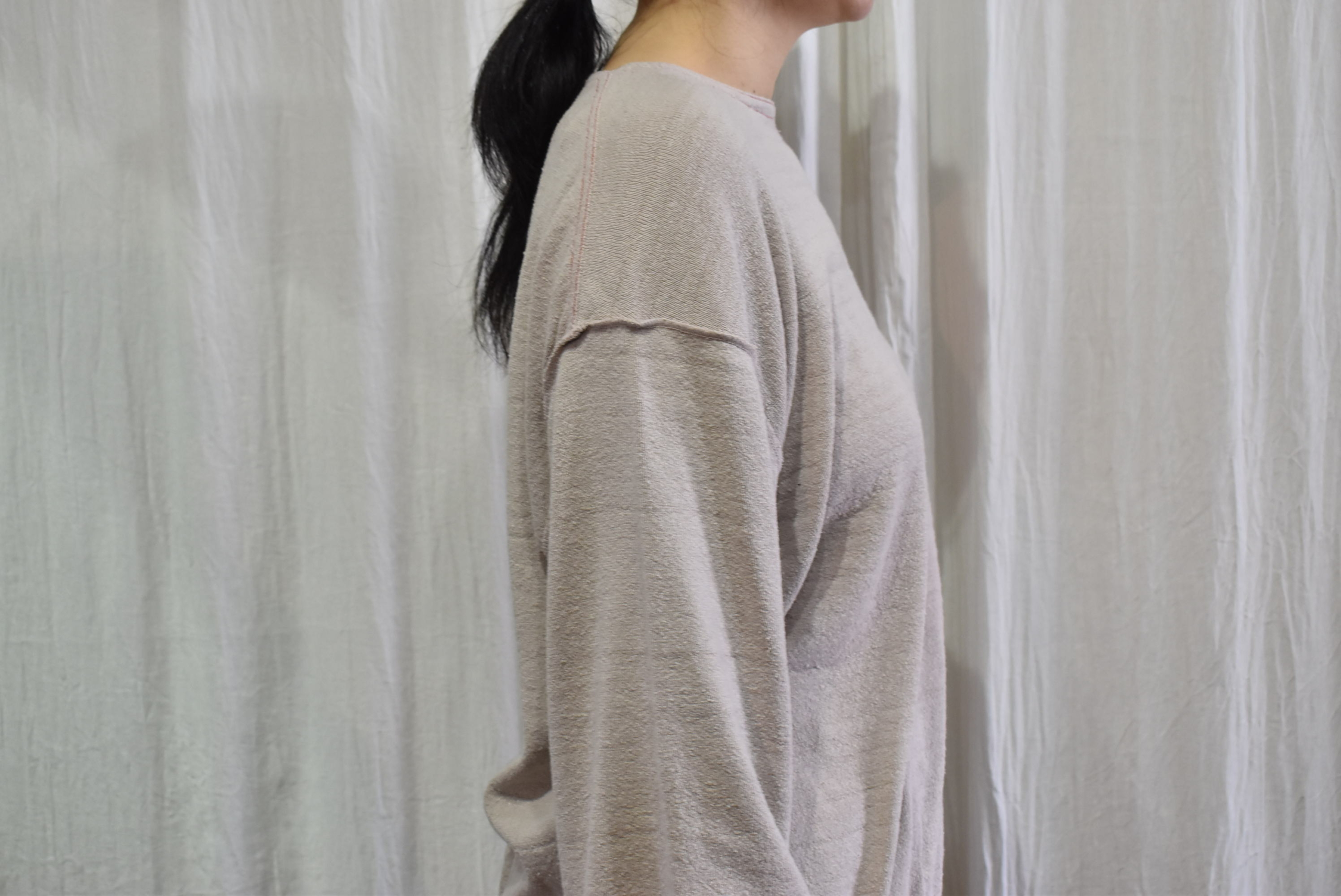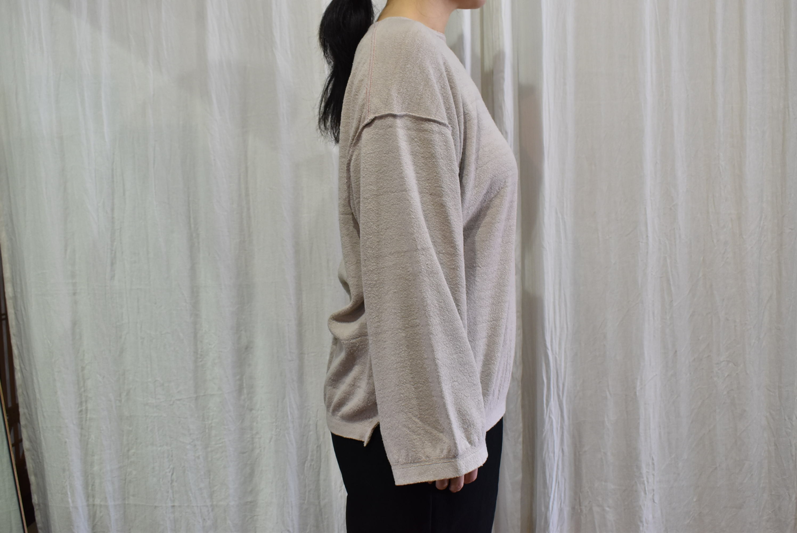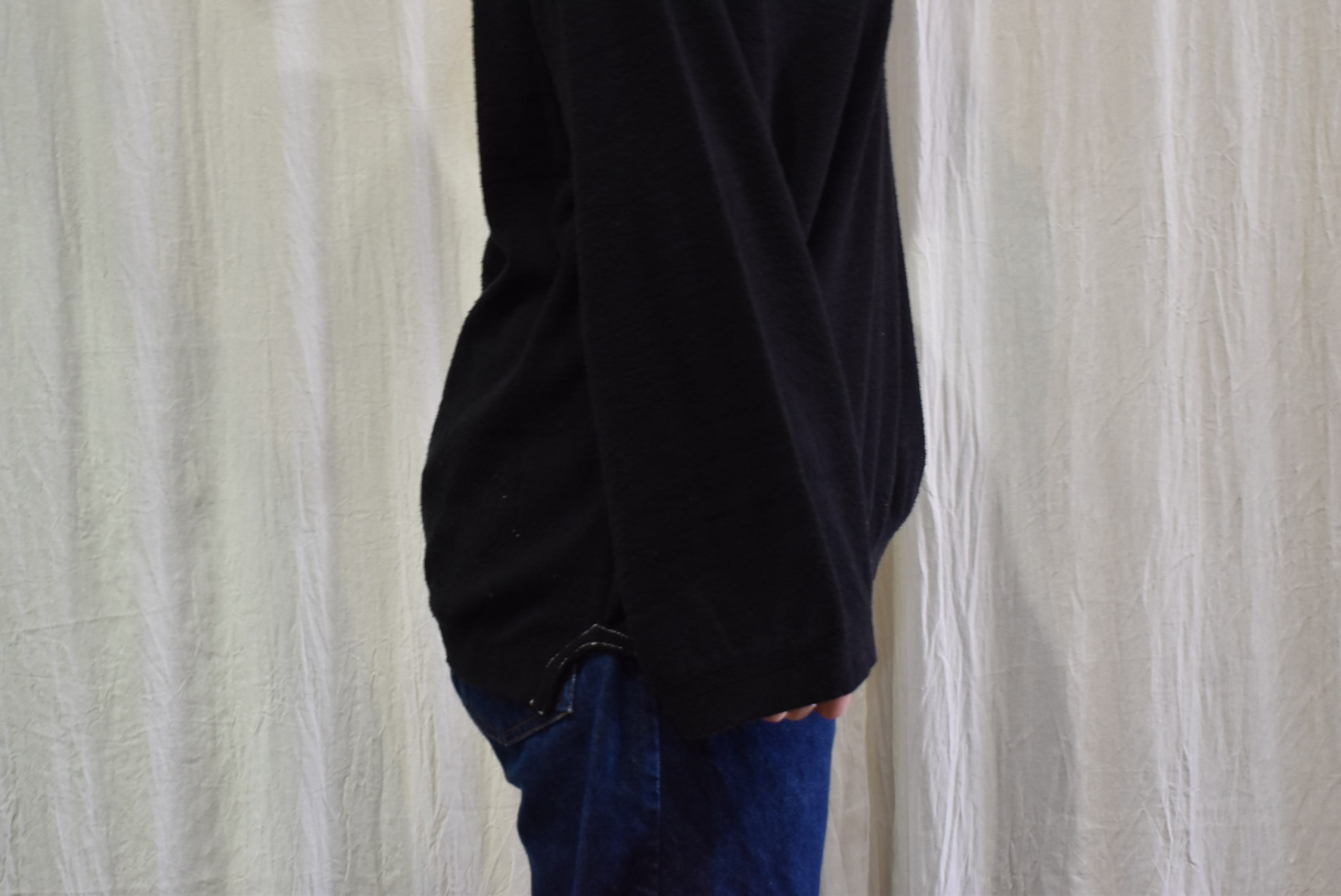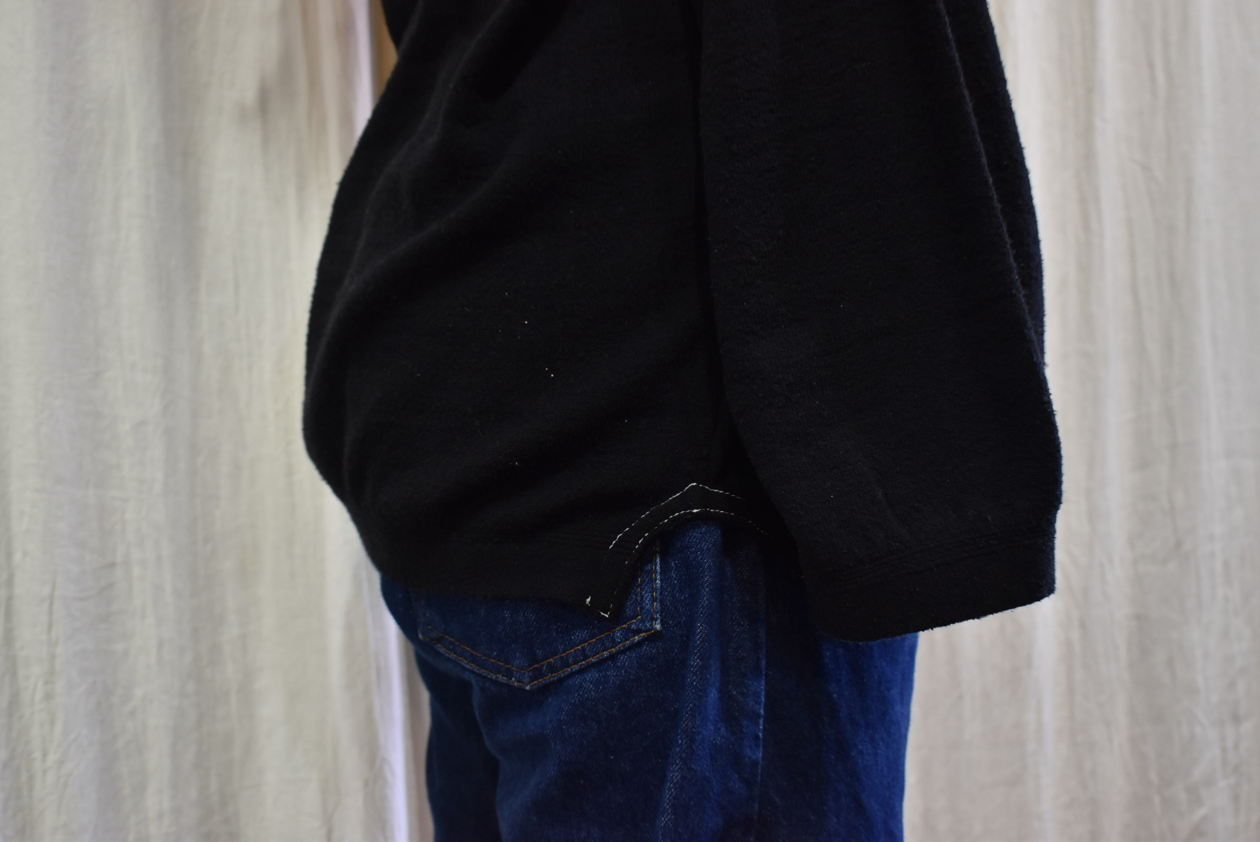 肩もしっかり目にドロップさせていますが、ニットならではの落ち感ととともに、柔らかで少しだけぽそぽそと節のある
