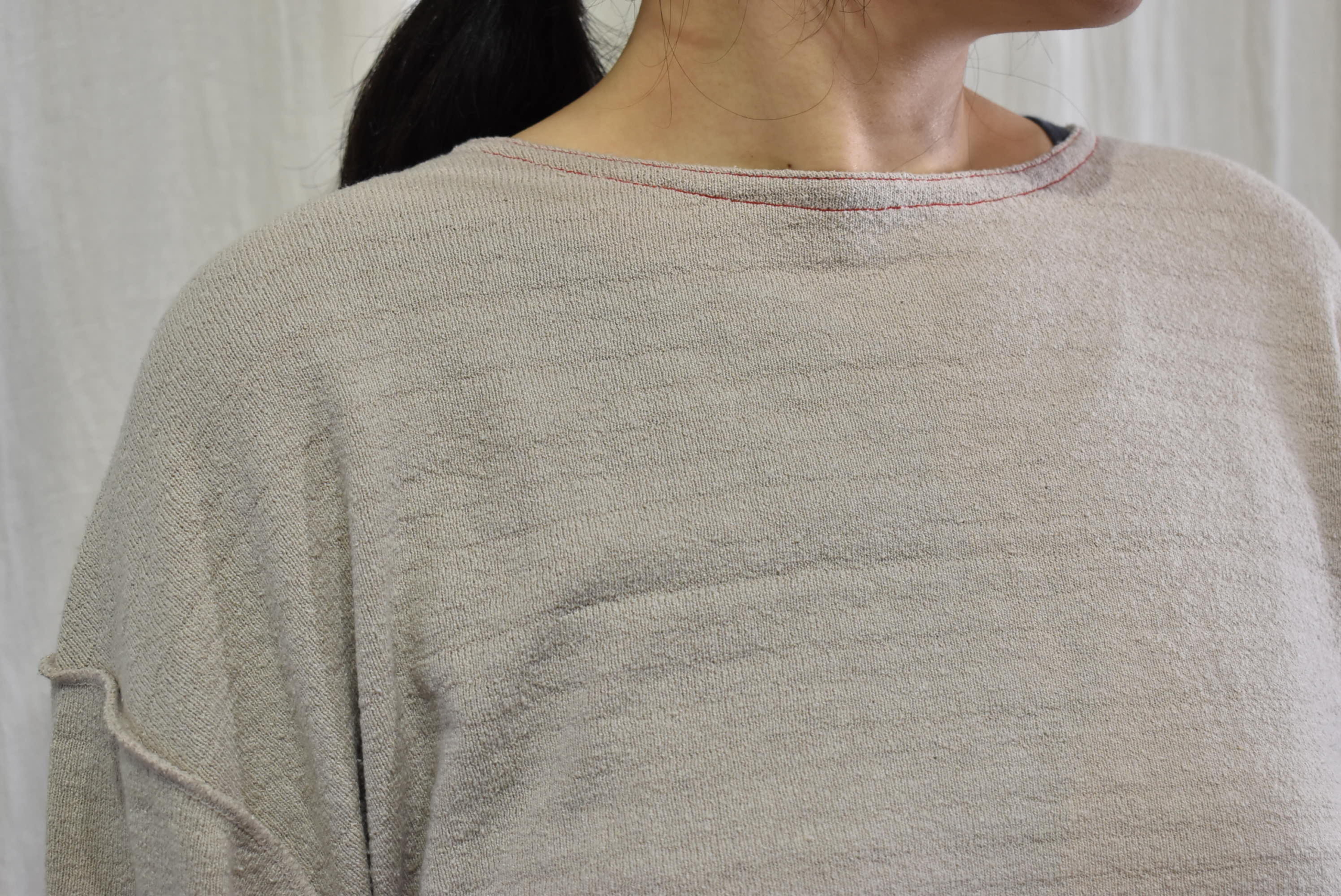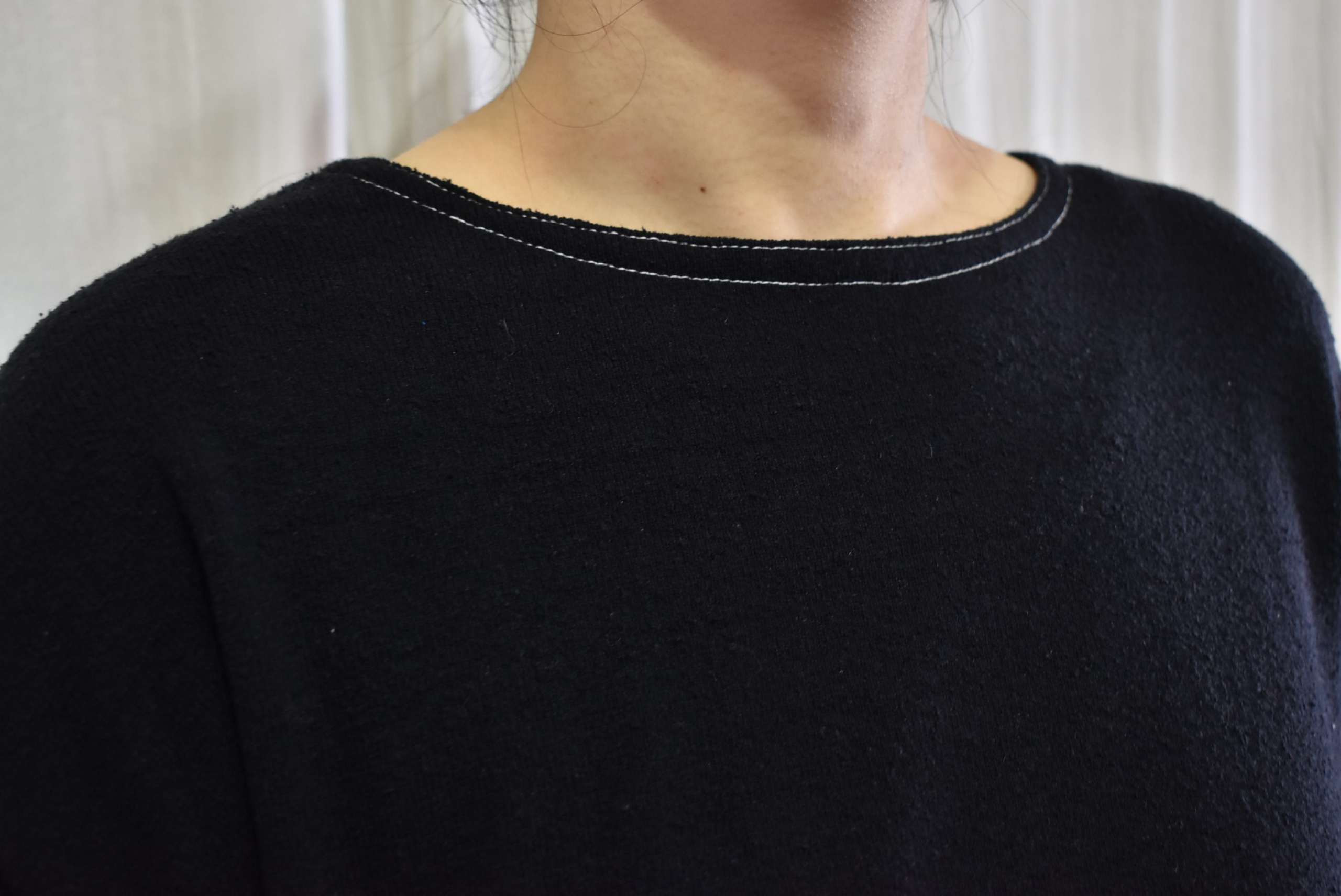 首元の開きを横に広く取り、ボートネックのように綺麗なラインを描きつつ、配色のステッチを入れたり