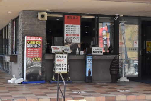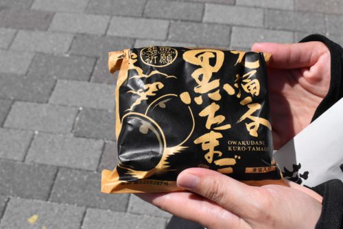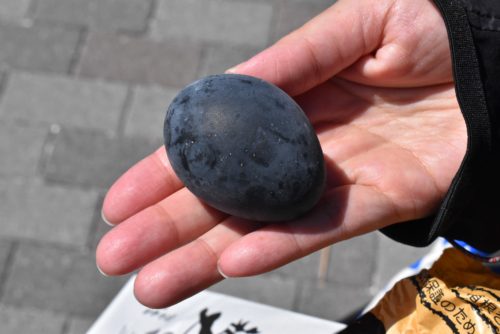 そして名物の黒タマゴ。大涌谷の地熱と火山ガスで作るたまごは見た目は真っ黒。中身はふっくら。